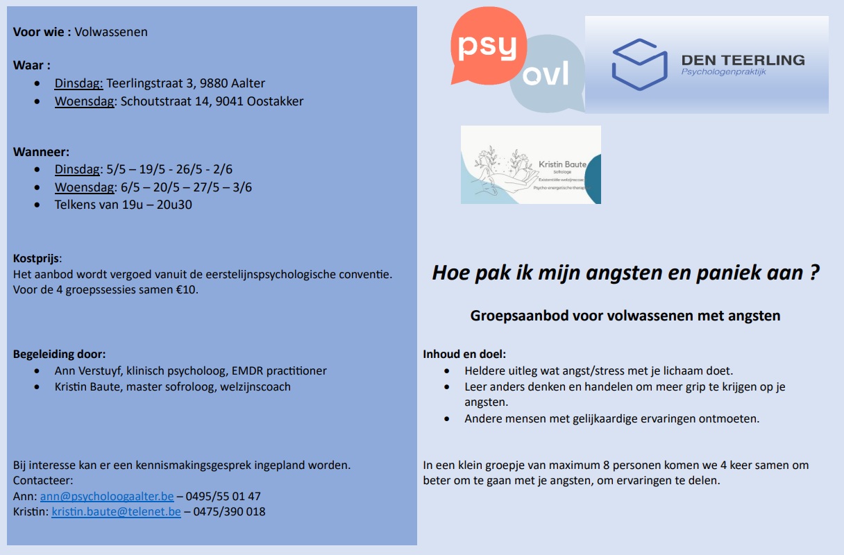 Je bent op zoek naar een psycholoog of je hebt een vraag ? Bij psychologenpraktijk Den Teerling staan we als klinisch psycholoog klaar voor volwassenen, jongeren en kinderen. We bieden individuele en groepstherapieën aan. Lees gerust verder en aarzel niet ons te contacteren als je vragen hebt of een afspraak wenst.